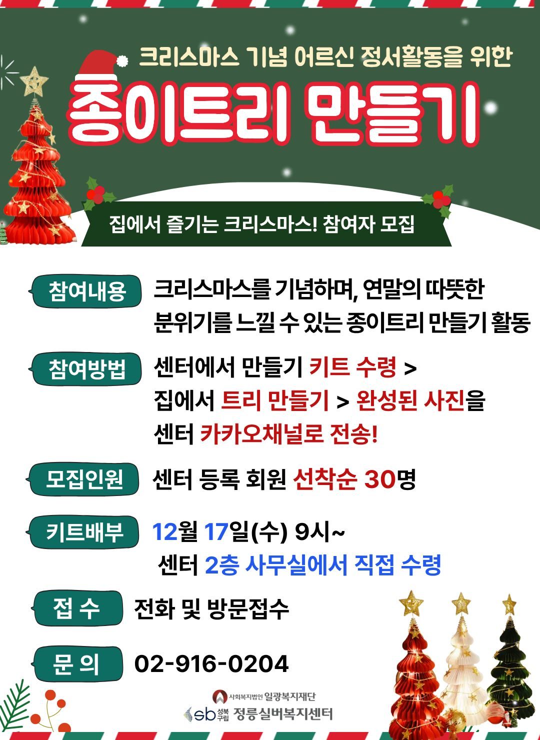 - 참여내용: 크리스마스를 기념하며, 연말의 따뜻한 분위기를 느낄 수 있는 종이트리 만들기 활동